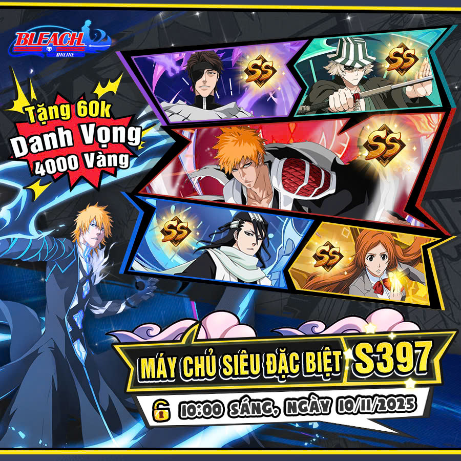Tưng bừng khai mở Máy Chủ S397 – Bleach Online vào lúc 10:00 ngày 10/11/2025.