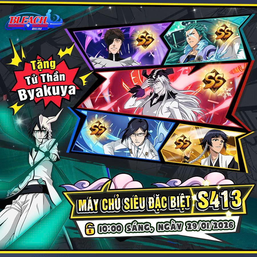 Tưng bừng khai mở Máy Chủ S413 – Bleach Online vào lúc 10:00 ngày 29/01/2026 . Tặng Bakuya UR